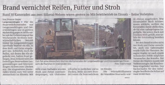 Etwa 30 Kameraden der freiwilligen Feuerwehren Langenweddingen und Osterweddingen rückten zum Löschen aus. Die eingesetzten Kameraden waren zum Teil unter Atemschutz im Einsatz. Mit Hilfe eines Radladers wurden Stroh und Futter auseinandergezogen, um Glutnester schneller zu entdecken und zu löschen. Mehr als zwei Stunden waren die Feuerwehrleute im Einsatz.