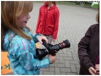 An der zweiten Station wurde uns die Technik eines Feuerwehrautos erläutert. Wir staunten darüber, was in so einem Auto alles stecken muss! Sogar auf dem Fahrersitz durften wir mal sitzen. Lustig war es, als wir mit der Handspritze durch den Wasserdruck ein Pappbildfeuer "löschen" konnten. Einige wurden dabei auch etwas nass.