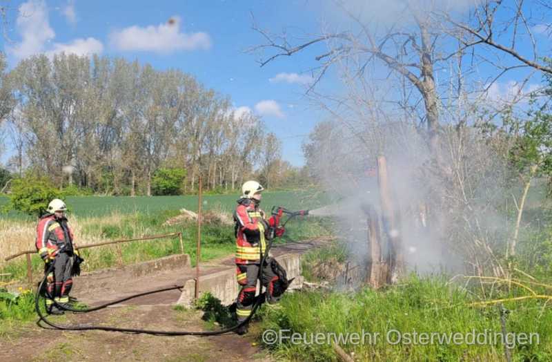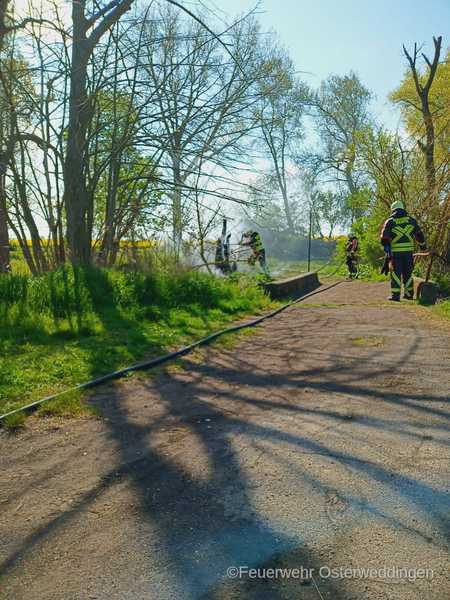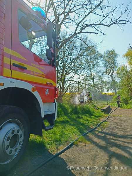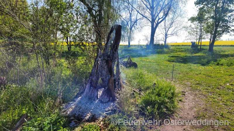 Wieder beschäftigte brennendes Holz die Kameraden der FF Osterweddingen. 10:08 Uhr ertönten die Pieper und die Sirene. Die Kameraden wurden zu einem brennenden Baumstumpf in die Alte Badeanstalt gerufen. Mit dem Löschgruppenfahrzeug und dem Tanklöschfahrzeug begaben sich die Kameraden auf den Weg zur Einsatzstelle. Dieser Weg hatte es aber in sich. Die Zuwegung war derart zugewuchert, dass der Einsatzleiter entschied das TLF an der Abzweigung zurück zu lassen und zunächst nur mit dem LF die Einsatzstelle anzufahren. In der Alten Badeanstalt entdeckten die Kameraden schnell das Objekt der Begierde, den brennenden Baumstumpf. Mit dem Schnellangriff des LF konnte der Brand schnell unter Kontrolle, gelöscht und eine Ausbreitung verhindert werden. Genau eine Stunde nach der Alarmierung wurden die Fahrzeuge wieder einsatzbereit in das Gerätehaus gestellt.